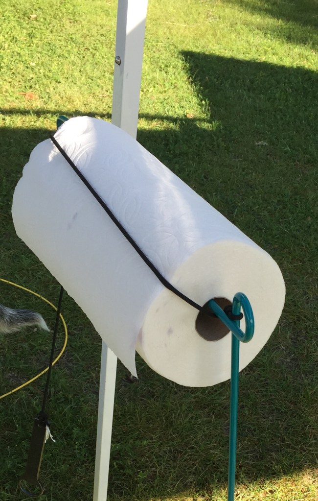 Paper towels seem to be a necessity when camp cooking. So, having them handy is a really nice perk. Based on a tip online somewhere a few years ago, one of those flag stands #ad is the right size to hold a roll of paper towels. The key is to keeping them from unrolling in the breeze. This is accomplished by using a piece of parachute cord #ad tied to the post side of the flag stand, draped over the roll, and given a wrap around the open end. This is kept from unraveling by the weight of a handy bottle opener. The bottle opener here was handmade and found on Etsy from BlackDogIronworks. It was important to find an opener with a hole for the paracord.