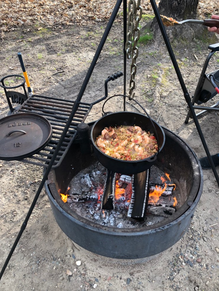 | Dinner | Jambalaya on the campfire Sourdough bread Salad greens and tomatoes | |