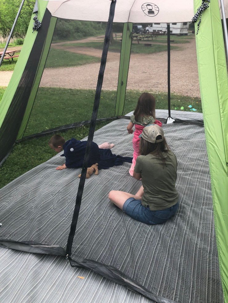 Instead, the kids went to the playground. We also set up the screen tent and rug to make a play area with protection from the sun.