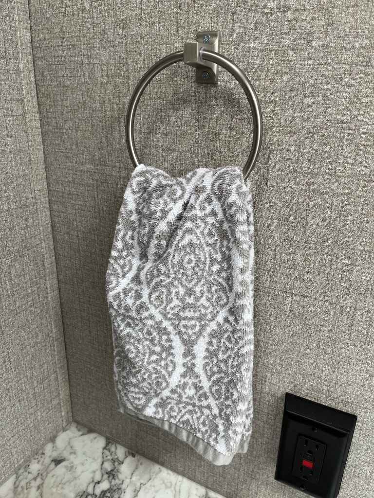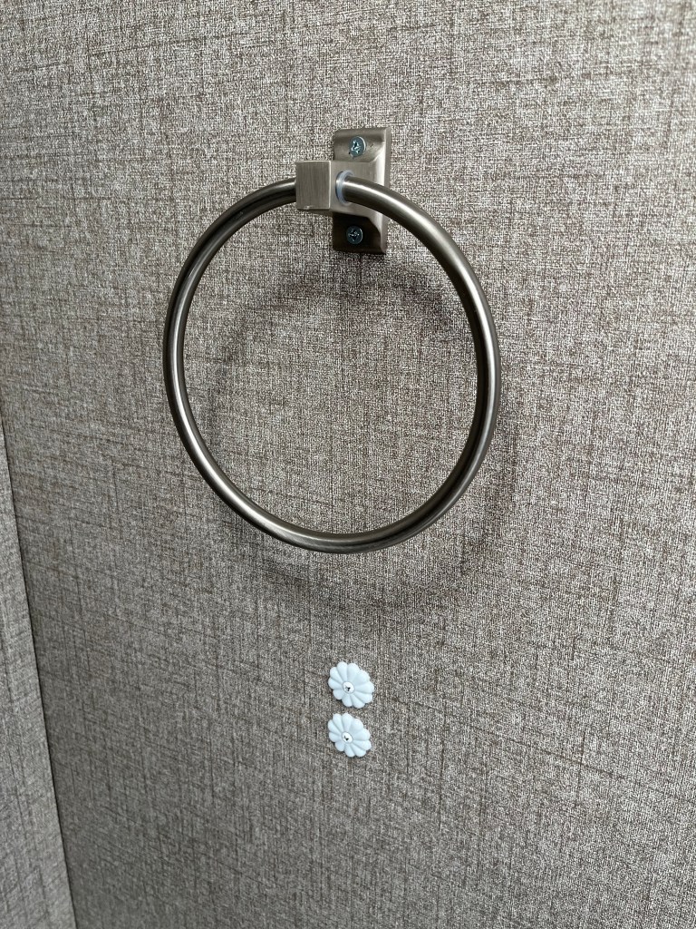 Just a couple of days before departure from home, I made a modification in the bathroom. The towel ring is mounted by the factory at a ridiculously low level above the countertop. I moved it up on the wall and plugged the original holes with rosettes. Those will be hidden behind a towel anyway.