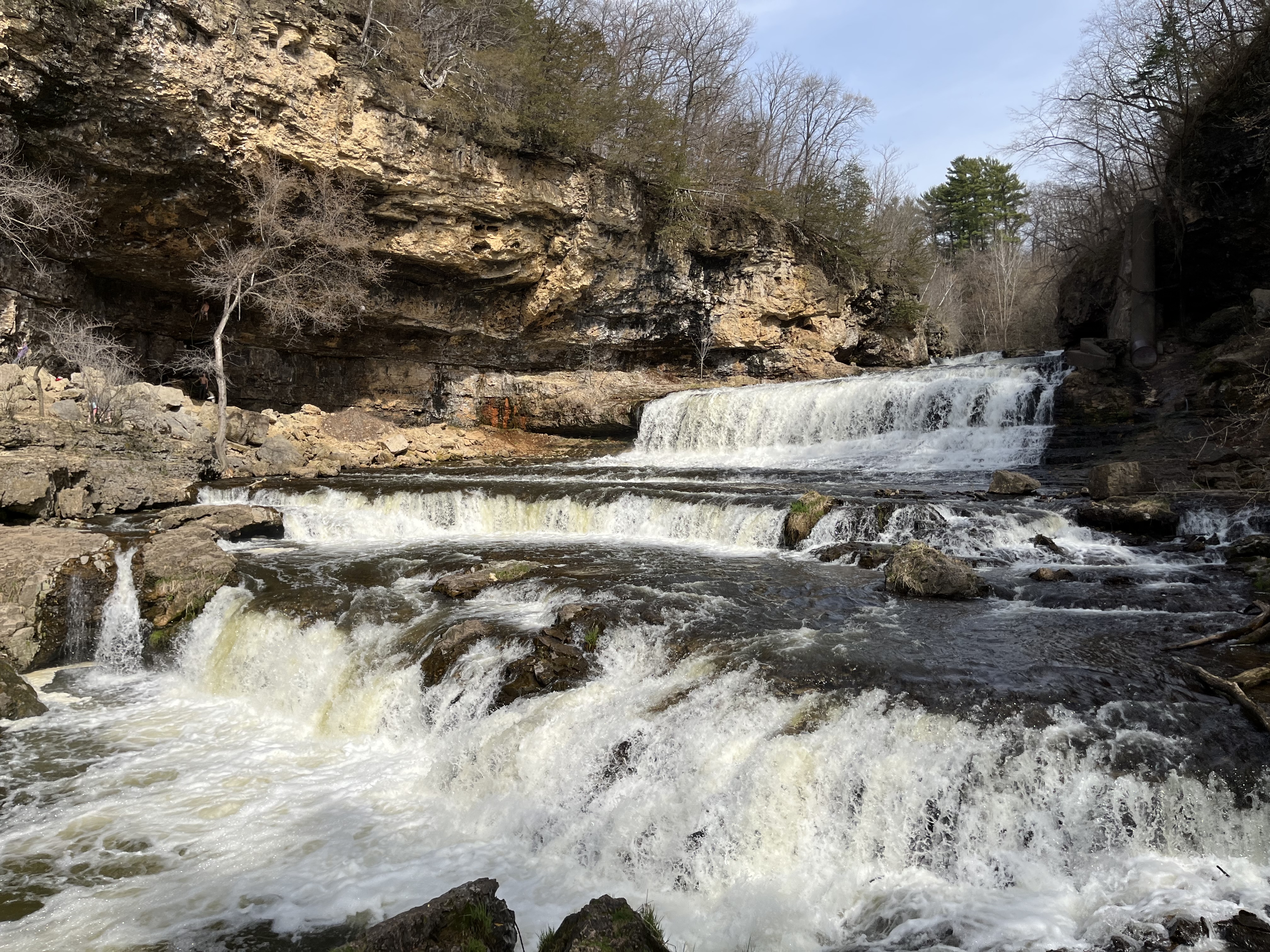 Lunch was simple — tuna salad sandwiches and potato chips. Following lunch, we struck out on a hike. We went down the steep trail that leads to the waterfall. Due to all the recent rain, the falls were running at a high volume.